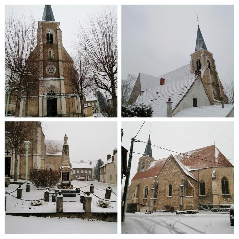 L’extérieur de l’ Édifice :Le bâtiment est construit en bloc de pierre calcaire. Le clocher porche carré est percé de baie double sur ses quatre faces, sa flèche est couverte d’ardoises. Les vitraux sont datés du XVIe siècle et du XVIIe siècle. L’église est épaulée par de nombreux contreforts. Cette église est édifiée sur une ancienne du XIIe siècle, elle est reconstruite au XIIIe siècle : sa voûte de style gothique et l’ouverture du mur sud. La magnifique grille monumentale du portail de l’église de la Celle sur Loire a été réalisée et mise en place par les élèves de l’école de Ferronnerie d’Art du Mont-Châtelet de Varzy, les trois et quatre juillet 2013. La nef et le clocher se sont effondrés le 1er juin 1846 suite aux crues de la loire, elle est entièrement reconstruite, celle-ci est inaugurée le 28 août 1859. Sources : |